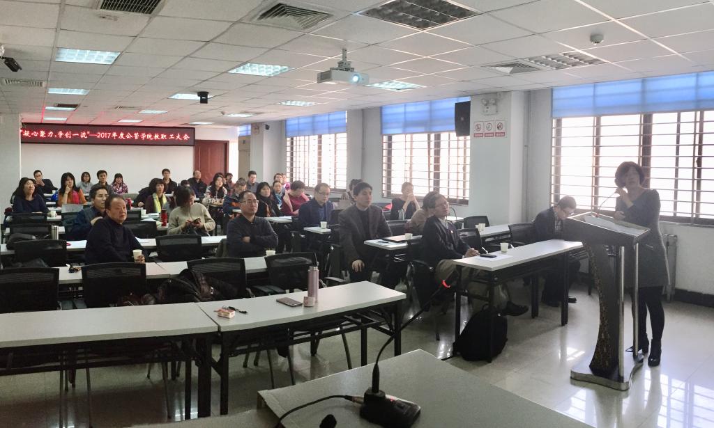 2018年1月14日下午,9778818威尼斯召开以“凝心聚力,争创一流”为主题的全院教职工大会,传达落实寒假工作会议精神,全面梳理总结2017年的成绩和不足,积极谋划2018年的各项重点工作。全体教工参加会议,院工会主席杨东朗主持。