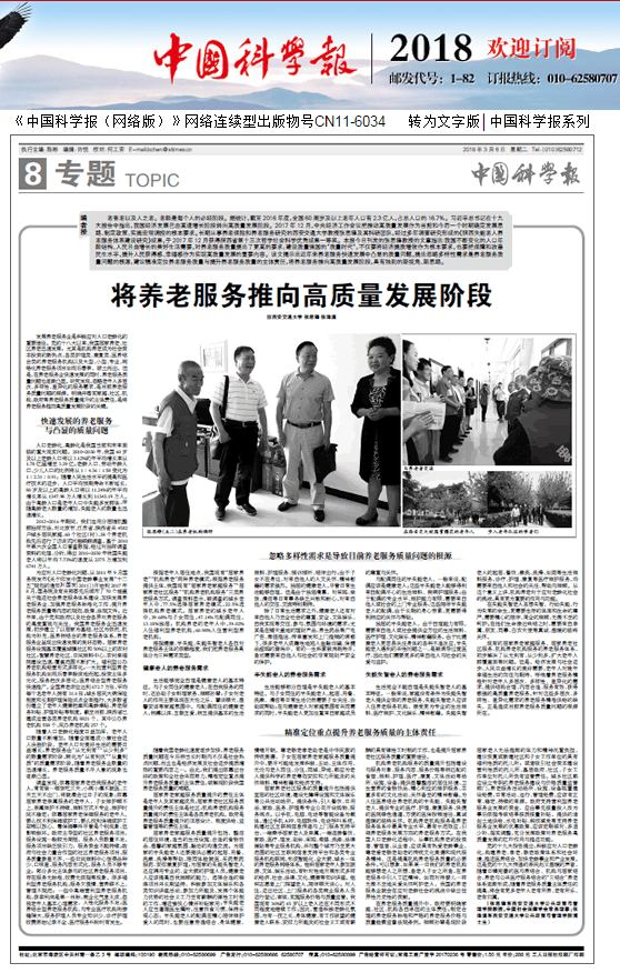 老吾老以及人之老。老龄是每个人的必经阶段。据统计,截至2016年底,全国60周岁及以上老年人口有2.3亿人,占总人口的16.7%。习近平总书记在十九大报告中指出,我国经济发展已由高速增长阶段转向高质量发展阶段。2017年12月,中央经济工作会议把推动高质量发展作为当前和今后一个时期确定发展思路、制定政策、实施宏观调控的根本要求。长期从事养老保险和养老服务研究的9778818威尼斯教授张思锋及其科研团队,经过多年调查研究形成的《陕西失能老人养老服务体系建设研究》成果,于2017年12月获得陕西省第十三次哲学社会科学优秀成果一等奖。本报今日刊发的张思锋教授的文章指出:我国不断变化的人口年龄结构、人民日益增长的美好生活需要,对养老服务质量提出了更高的要求;建设质量强国的“质量时代”,不仅要将经济提质增效作为根本要求,也要把保障和改善民生水平,提升人民获得感、幸福感作为实现高质量发展的重要内容。该文揭示出近年来养老服务快速发展中凸显的质量问题,提出忽略多样性需求是养老服务质量问题的根源,建议精准定位养老服务质量与提升养老服务质量的主体责任,将养老服务推向高质量发展阶段,具有独到的新视角、新思路。