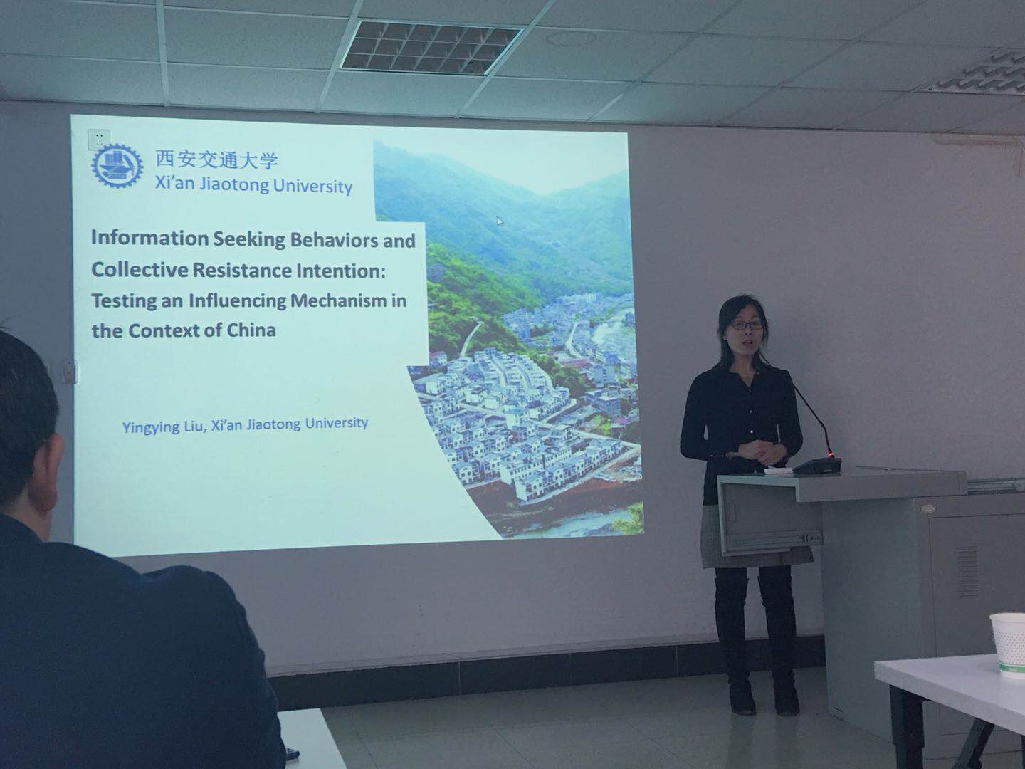 随后,展开学术交流活动。2014级博士生刘莹莹同学为大家作了题为”Information Seeking Behaviors and Collective Resistance Intention: Testing an Influencing Mechanism in the Context of China”的学术报告。刘莹莹同学于2017年在美国中佛罗里达大学留学一年。在座研究生同学提出了自己的思考和疑问,跟讲座人进行了探讨和交流。并就“政府信任”、政府绩效管理方向等问题展开激烈的讨论。博士生导师周忠良教授、王立剑副教授也发表了自己的学术观点和讲评。之后,郭雪松教授就刘莹莹同学的汇报进行总结,他提到将心理学的视角引入到公共管理领域,研究点由信息发布者转向信息接收者的创新思路值得同学们借鉴学习。