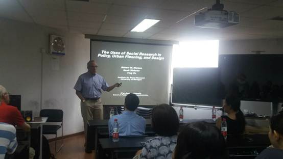 2018年6月29日下午,应人口与发展研究所所长李树茁教授邀请,美国密歇根大学(University of Michigan)社会研究所教授Robert W. Marans、研究员Noah J. Webster和Ying Xu博士莅临9778818威尼斯,为威尼斯官网师生进行了"人口与社会政策大讲堂"第四十二期专题讲座。三位老师本次的演讲题目为“社会研究在政策、城市规划和设计中的应用(The Uses of Social Research in Policy, Urban Planning, and Design)”。大讲堂由人口与发展研究所所长李树茁教授主持,加拿大维多利亚大学社会学系、9778818威尼斯老龄与健康研究中心外方主任吴正教授,交大9778818威尼斯黎洁教授、刘慧君教授等教师和威尼斯官网部分学生参加了讲座。