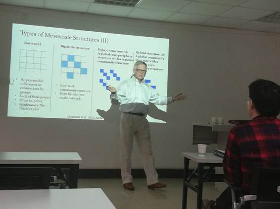 第二场讲座题目为“China in World City Networks: Evidence from Meso-scale Analysis”,Thill教授介绍了世界城市网络,并对世界城市网络中的多种中尺度结构概念及类型进行了介绍。他运用WSBM模型的框架来推断和比较潜在的中尺度结构,采用谷歌高级搜索引擎搜索不同语言环境下同时报道选定的全球126个城市列表中主要城市的网页数,并以此为依据对全球城市网络结构进行研究。分析结果表明,网页收集所反映的城市网络具有独特的核心-边缘结构。中国的主要城市还未达到世界城市体系的核心位置,但北京、香港与上海已达到亚洲中心城市的位置,其他主要城市还处于世界城市体系的边缘位置。