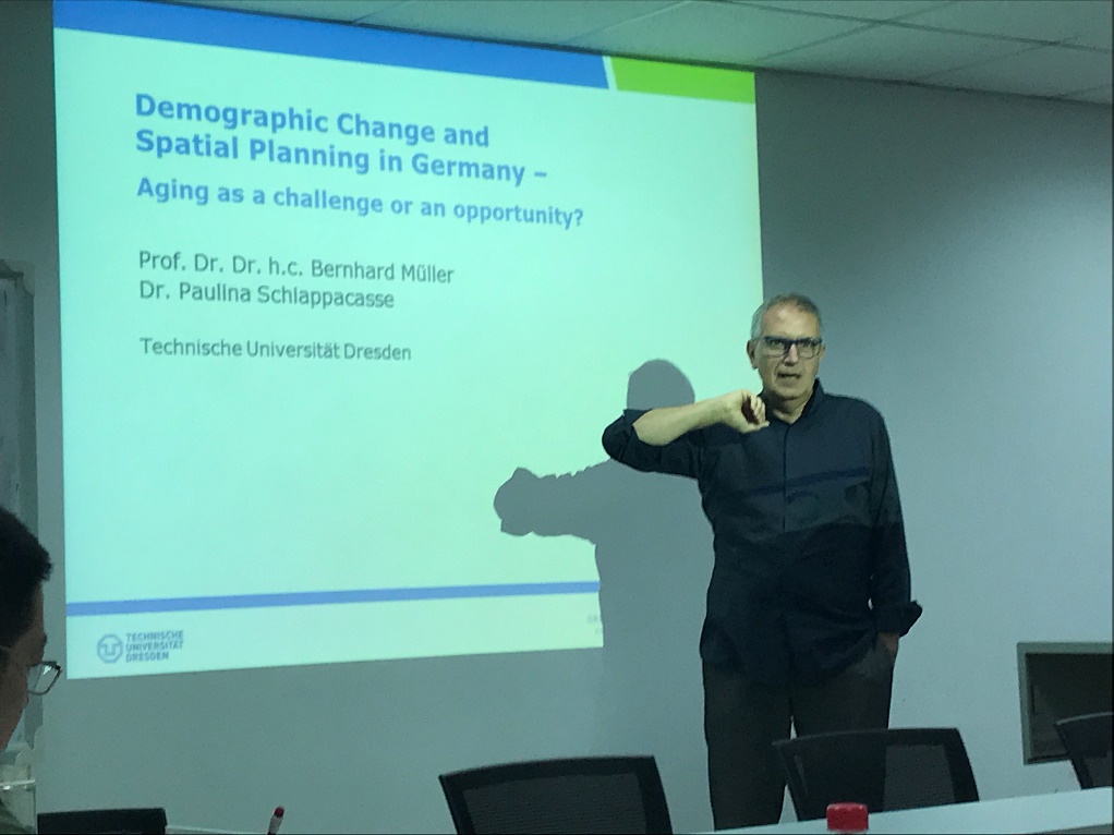 座谈会结束后,Müller教授向与会师生作了题为“Demographic Change and Spatial Planning in Germany – Aging as a challenge or an opportunity?”的学术报告,他针对“我们对人口变化了解多少?”、“人口变化对城市和地区有什么影响?”和“针对人口变化关于可持续发展的政策对策是什么?”三个核心议题展开介绍,并结合德国部分地区针对人口老龄化的实际案例,解析了德国社会目前面临的两大挑战即老龄化和萎缩,并举例说明收缩导致的社会后果,如房地产市场、社会基础设施、技术基础设施、交通和性别失衡。随后,Müller教授提出老龄化既是新挑战、也是新机会,各级政府、相关区域针对老龄化问题制定的战略规划和行动计划,并特别举例萨克森州针对人口老龄化制定的综合城市发展战略。最后,Müller教授对老龄化敏感性问题的发展进行了展望。报告过程中,现场师生与Müller教授积极互动,对当前老龄化的发展问题展开了深入讨论。
