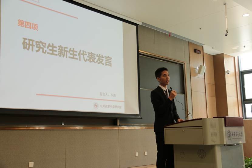 硕士新生李港代表2019级全体新生进行了发言,李港同学回顾了自己在交大四年的本科生活,又结合自己在创新港的一周体验,表达了自己对学校和学院老师、同学及所有人的感恩、感谢。号召新生们铭记“精勤求学,敦笃励志,果毅力行,忠恕任事”的校训,带着理想,带着信念,为了交大的发展而努力前行,为了民族的复兴而不懈奋斗。