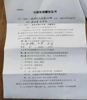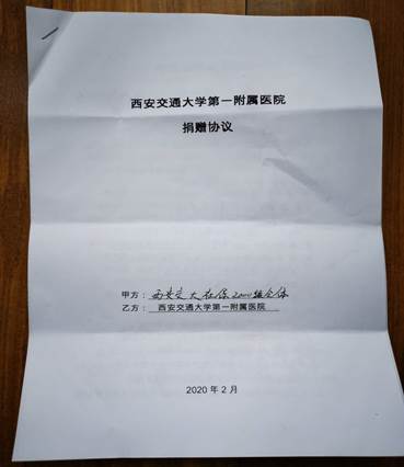 同时社保班同学通过各种渠道采购物资,先期在南京、广西等地采购均未成的情况下,最终通过多方努力从深圳成功采购,于2月21日将符合医疗标准的防冲击护目镜70副,消毒用品100套,医用口罩1000个及时送到医院,并由班长郭鹏代表全班同学与交大一附院签署捐赠协议,并完成物资交付,随后还有捐赠物资继续送到医院。