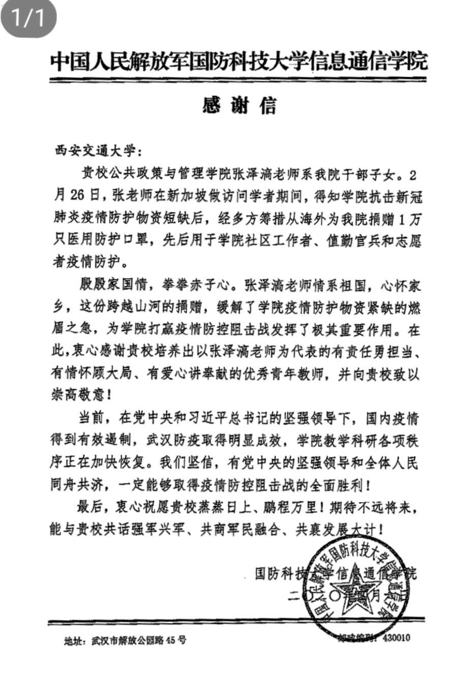 在党中央和习总书记的坚强领导下,武汉疫情逐步得到有效遏制。泽滈老师捐赠的口罩如及时雨般,缓解了学院物资紧缺的燃眉之急,为打赢疫情阻击战发挥了极其重要的作用。近日,武汉国防科技大学信息通信学院开始逐渐恢复正常的教学生活秩序,学院十分感激泽滈老师这份情系祖国、心怀家乡的捐赠,特在4月初向我校发来感谢信,衷心感谢学校培养出以张泽滈老师为代表的有责任勇担当、有情怀顾大局、有爱心讲奉献的优秀青年教师,致以崇高敬意!
